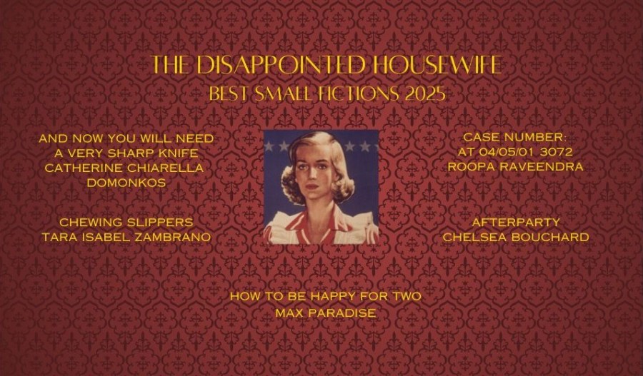 As usual, whittling our published fiction down to these five was difficult, since my approach to curating the magazine is to accept material that could win just about any award. That’s why, at times, it seems like we’re not publishing much, Dottie and I, but it’s not because we’re slacking. We think, as a matter of fact, that The Disappointed Housewife is a de facto Best Small Fictions anthology all year long.
