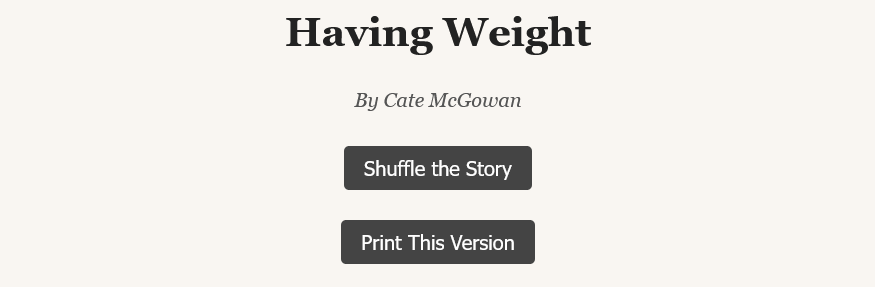 “Having Weight” is a modular story that mirrors the narrator’s fractured state of mind, prompting the reader to collaborate in constructing meaning from the apparent chaos. Each time the reader visits the page or clicks “Shuffle,” the narrative reorders itself, resisting a straight plot in favor of emotional constellations. The print button generates different “permanent” versions, further emphasizing the mutability of memory and how everything depends on when an event occurs. “Having Weight” utilizes simple HTML code and random number generation (RNG).