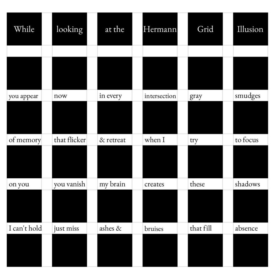 Victoria Nordlund is the Poet Laureate of Glastonbury, CT, and lead master teaching artist of The Nook Farm Writers Collaborative at The Mark Twain House & Museum. Her poetry collections Wine-Dark Sea and Binge Watching Winter on Mute are published by Main Street Rag. She is a Best of the Net and Pushcart Prize Nominee, whose work has appeared in PANK Magazine, Rust+Moth, Chestnut Review, Maudlin House, trampset, and elsewhere. Visit her at VictoriaNordlund.com.While looking at the Hermann Grid Illusion ~ poetry by Victoria Nordlund