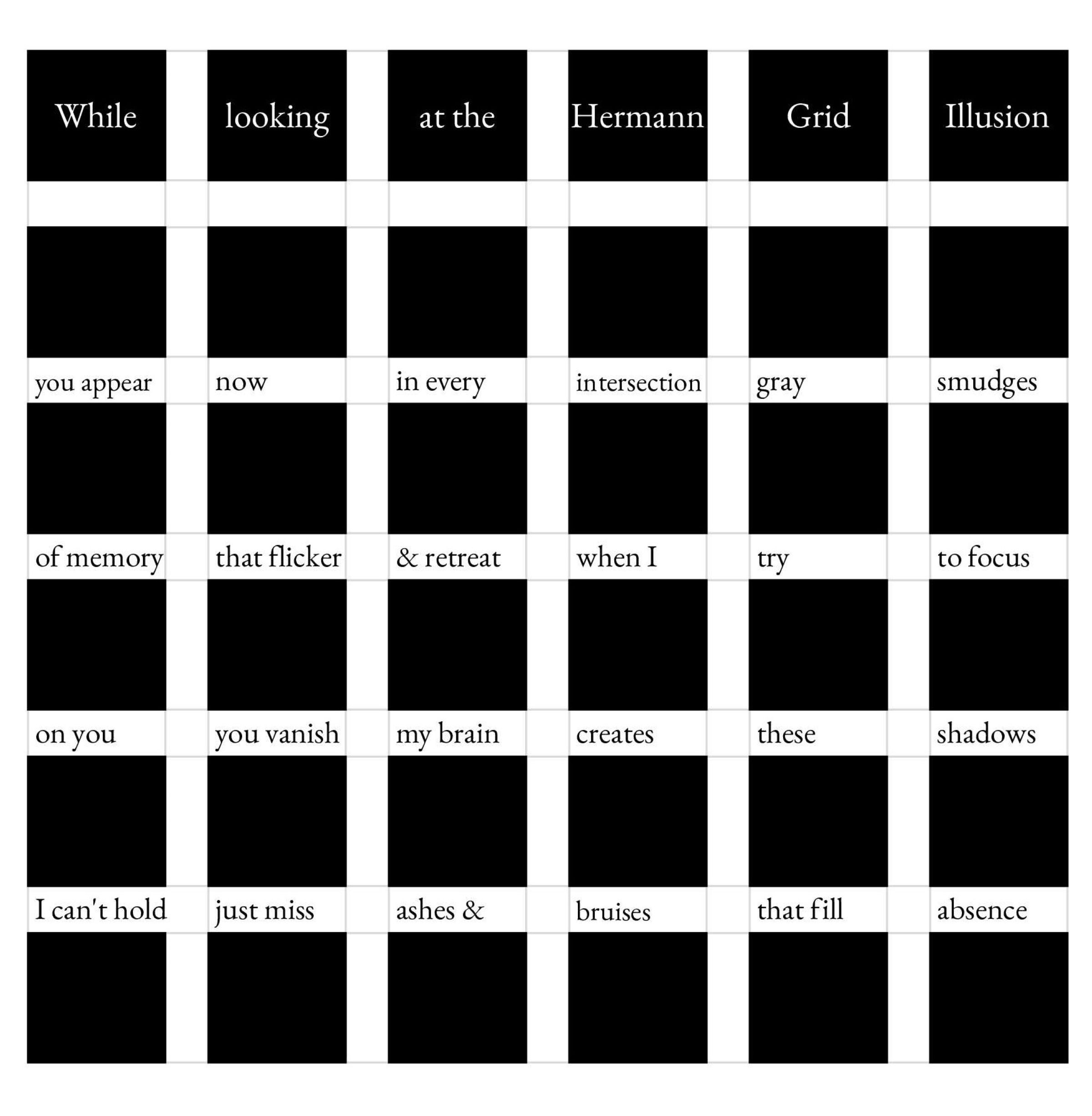Victoria Nordlund is the Poet Laureate of Glastonbury, CT, and lead master teaching artist of The Nook Farm Writers Collaborative at The Mark Twain House & Museum. Her poetry collections Wine-Dark Sea and Binge Watching Winter on Mute are published by Main Street Rag. She is a Best of the Net and Pushcart Prize Nominee, whose work has appeared in PANK Magazine, Rust+Moth, Chestnut Review, Maudlin House, trampset, and elsewhere. Visit her at VictoriaNordlund.com.While looking at the Hermann Grid Illusion ~ poetry by Victoria Nordlund
